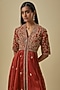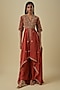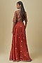 Featuring a rust anarkali in silk base with zardosi embroidery. It is paired with palazzo pants. Accentuate it with statement jewellery and heels for a festive occasion, wedding or sangeet ceremony.