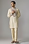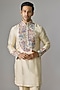 Featuring a beige kurta in silk base. It is paired with pants. Style it with kolhapuri sandals and a festive occasion, wedding or engagement ceremony.