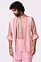 Featuring a pink bundi jacket in silk base. It is paired with a kurta and pants. Style it with a pair of loafers for a wedding, engagement or sangeet ceremony.
