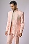 Featuring a peach indo-western jacket in raw silk base. It is paired with a kurta, pants and kamarbandh. Style it with mojaris for a festive occasion, wedding or engagement ceremony.