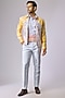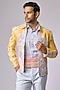 Featuring a sky blue and yellow bomber jacket in silk base. It is paired with a shirt, pants and kamarbandh. Style it with mojaris for a festive occasion, wedding or engagement ceremony.