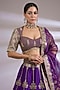 Featuring a purple lehenga in banarasi, shimmer organza and raw silk base with embroidery. It is paired with an embroidered blouse and an embroidered dupatta. Accentuate it with kundan polki or gold jewellery, embellished heels and a potli bag for a bridal look, Perfect wear for your wedding or engagement ceremony.