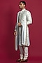 Featuring a light blue sherwani in raw silk and banarasi base with jaal, zardosi and resham hand embroidery. It is paired with a matching chanderi silk kurta, spun silk churidar pants and a cotton satin dupatta.