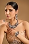 Featuring a black rhodium finish statement necklace studded with zircons and multi-colored stones, set in brass. It is paired with a matching of pair of earrings, a ring and a bracelet. Add a touch of sparkle to your ensemble, perfect for festive occasions or wedding ceremony.