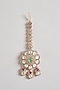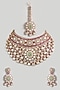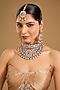 Featuring a gold finish choker necklace studded with kundan polki and green stones, set in brass. It is paired with a matching of pair of earrings and a maangtikka. Add a touch of sparkle to your ensemble, perfect for engagement or wedding ceremony.