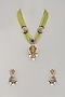 Featuring a gold finish long beaded necklace studded with uncut kundan polki, pearls, lemon yellow and peach kite shaped stone, set in brass. It is paired with a matching pair of earrings. Perfect wear for festive occasions or wedding ceremonies.