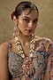 Featuring a gold finish long temple necklace studded with kundan polki, ruby, emerald agate beads, pearls and pink stones, set in brass. It is paired with a matching pair of earrings. Perfect wear for any festive occasion or wedding ceremony.
