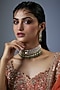 Featuring a gold finish choker necklace studded with uncut kundan polki and synthetic emerald beads, set in brass. It is paired with matching pair of earrings. Perfect choice for destination weddings and other indian festivities.