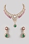 Featuring a two-tone finish choker necklace studded with kundan polki and multi-colored stones, set in brass. It is paired with a matching of pair of earrings. Add a touch of sparkle to your ensemble, perfect for festive occasions or wedding ceremony.