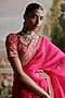 Featuring a hot pink saree in organza base with antique gold dori, aari and hand embellishment. It is paired with a chanderi silk blouse and a petticoat. Style it with a necklace, dangler earrings and heels for a wedding or engagement ceremony.