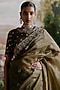 Featuring an olive green saree in organza base with antique gold dori, aari and hand embellishment. It is paired with a chanderi silk blouse and a petticoat. Style it with a necklace, dangler earrings and heels for a mehendi, wedding or engagement ceremony.