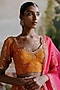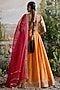 Featuring an orange lehenga in raw silk base with antique gold dori work and hand embroidery. It is paired with a blouse and an organza dupatta. Style it with polki jewellery and heels for a bridal look.