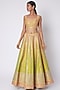 Featuring a lime green lehenga in raw silk base with gota work embroidery. It is paired with a matching blouse and dupatta.