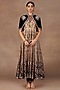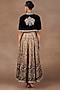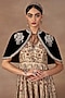 Featuring a beige and green ombre anarkali in cotton silk base with kora, crystals, kasab and mother of pearl embroidery. It is paired with cotton lycra churidar pants and a black silk velvet embroidered gilet. Accentuate it with gold drop earrings, a sleek bun and block heels for a wedding or a mehendi ceremony.