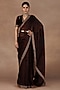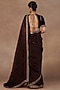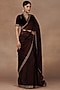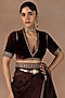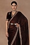 Featuring a burgundy jamawar saree in satin organza base with antique gold metallic embroidery. It is paired with a silk velvet blouse having antique gold metallic embroidery, including a cotton lycra underskirt. Accentuate it with gold drop earrings, a sleek bun and block heels for a wedding or a sangeet ceremony.