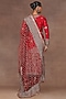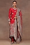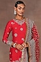 Featuring a cherry red tunic in silk base with zari, crystals, sequins, resham thread and antique gold metallic embroidery. It is paired with silk salwar pants and a silk organza stole. Accentuate it with polki earrings, a sleek bun and block heels for a wedding or a mehendi ceremony.