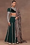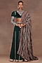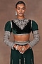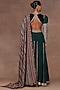 Featuring emerald green sharara pants in georgette base with resham, zari, sequins and antique gold metallic embroidery. It is paired with a velvet silk blouse and a multi-colored georgette stole. Accentuate it with diamond earrings, a sleek bun and block heels for a wedding or a mehendi ceremony.