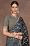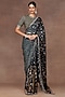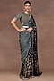 Featuring an emerald green ombre saree in georgette base with print, zari and sequins embroidery. It is paired with a striped blouse and a cotton lycra underskirt. Accentuate it with gold drop earrings, a sleek bun and block heels for a wedding or a mehendi ceremony.