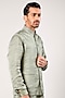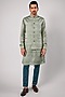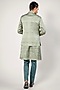 Featuring a medium green nehru jacket in linen satin base with geometric embroidered brooch and print. Perfect wear for a festive occasion or mehendi ceremony, exuding charm and elegance.