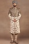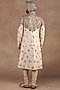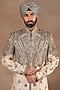 Featuring a beige sherwani in silk base with kasab, dabka, beads and sequins embroidery. It is paired with a silk kurta and cotton lycra churidar. Style it with mojaris and safa for a wedding or engagement wear.