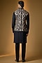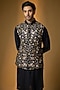 Featuring a midnight blue bundi jacket in silk base with resham embroidery. It is paired with a silk kurta and cotton lycra churidar. Style it with pair of mojaris and a bracelet for a festive occasion, wedding or engagement ceremony.