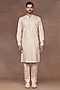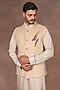Featuring a cream nehru jacket in cashmere base with kasab, dabka work and motif embroidery. It is paired with a silk kurta and viscose pants. Style it with mojaris for a cultural event, wedding, sangeet or engagement wear.