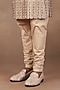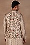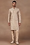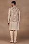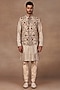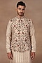 Featuring a soft pink nehru jacket in silk base with crystal, kasab, dabka work and resham embroidery. It is paired with a silk kurta and cotton lycra churidar. Style it with mojaris for a cultural event, wedding, sangeet or engagement wear.