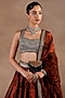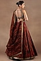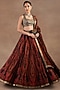 Featuring a red lehenga in silk base with jamawar print, zari, beads, crystals and antique gold metallic embroidery. It is paired with a blouse and a silk organza stole having jamwar print. Accentuate it with gold drop earrings, a sleek bun and block heels for a wedding or a sangeet ceremony.