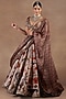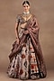 Featuring a taupe lehenga in silk base with ikat print, resham, bugle beads, sequins zardosi, crystal and antique gold metallic embroidery. It is paired with a maroon blouse and a maroon ikat printed silk organza stole. Accentuate it with polki earrings, a sleek bun and wedges for a wedding or a sangeet ceremony.