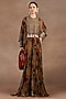 Featuring a taupe kaftan in silk velvet base with ikat print, bugle beads, zari and antique gold thread embroidery. Accentuate it with gold stud earrings, a clutch and block heels for evening soirees or a festive look.