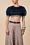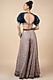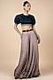 Featuring a midnight blue blouse in satin linen and tulle base with dori, zari and sequins work. It is paired with a blush nugrey bamberg silk geometric printed sharara pants. Accentuate it with statement jewellery and heels for a festive occasion or sangeet ceremony.