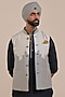 Featuring a black and ivory nehru jacket in silk base with a mandarin collar. Style it with a kurta set and mojaris for a festive celebration, cultural event, wedding or engagement ceremony.