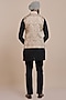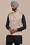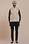 Featuring a cream ivory nehru jacket in satin linen base with ikat print. Style it with a kurta set and mojaris for a festive celebration, cultural event, wedding or engagement ceremony.