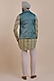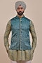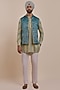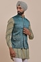 Featuring a teal blue nehru jacket in satin linen base with floral pattern. Style it with a kurta set and mojaris for a festive celebration, cultural event, wedding or engagement ceremony.