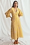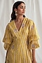 Featuring a yellow dress in chanderi base with V-neckline, puffed sleeves, hand-block print and beadwork embroidery. Accentuate it with statement earrings and heels for evening wear.