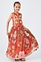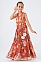 Featuring an orange lehenga for girls in lurex georgette base with print. It is paired with an embellished dupion silk vest top and a soft net dupatta. Style it with sandals and hair accessories for a festive occasion or sangeet ceremony.