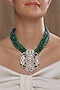 Featuring a gold finish pendant chain necklace studded with blue and dark green beads, set in brass. Perfect wear for festive celebrations or special occasions.