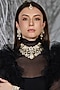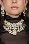 Featuring a gold finish necklace studded with crystal drops, set in brass. It is paired with a matching pair of earrings and a maangtikka. This necklace set radiates timeless elegance, perfect for wedding celebrations, festive soirees, cultural gatherings or evening events, adding a regal charm to every look.