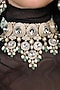 Featuring a gold finish necklace studded with crystal stones and light green stones, set in brass. It is paired with a matching pair of earrings and a maangtikka. This necklace set radiates timeless elegance, perfect for wedding celebrations, festive soirees, cultural gatherings or evening events, adding a regal charm to every look.