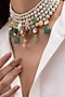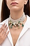 Featuring a gold finish choker necklace studded with emerald beads and mirror work, set in brass. Perfect for grand occasions like weddings and traditional festivities.