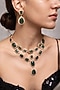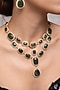 Featuring a gold finish necklace studded with emerald green stones, set in brass. It is paired with a matching pair of earrings. Perfect for grand occasions like weddings and traditional festivities.