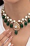 Featuring a gold finish choker necklace studded with green gemstone, pearls and kundan polki, set in brass. It is paired with a matching pair of earrings. Perfect for grand occasions like weddings and traditional festivities.