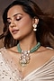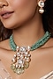 Featuring a gold finish handcrafted temple pendant necklace studded with kundan polki, pink enamel, zircons, green fluoride drops and agate beads, set in brass. It is paired with a matching pair of earrings.
