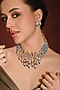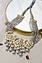 Featuring a gold finish choker necklace studded with green stones, set in brass. It is paired with a matching pair of earrings. Perfect choice for weddings, parties, and for other Indian festivities.