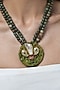 Featuring a gold finish long pendant necklace studded with green stones, set in brass. Add a touch of sparkle to your ensemble, perfect for festive occasions, evening soirees or cocktail parties.