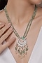 Featuring a gold finish pendant necklace studded with green stones, set in brass. Perfect wear for festive celebrations or special occasions.