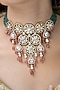Featuring a gold finish necklace studded with green stones, set in brass. It is paired with a matching pair of earrings. Ideal for festive occasions, weddings, or elevating your elegant evening look.