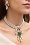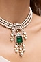 Featuring a gold finish layered necklace studded with green stone and pearls, set in brass. It is paired with a matching pair of earrings. Perfect for grand occasions like weddings and traditional festivities.