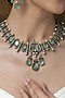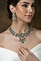 Featuring a gold finish pendant necklace studded with green stones, set in brass. It is paired with a matching pair of earrings. Add a touch of sparkle to your ensemble, perfect for festive occasions, weddings or sangeet ceremony.