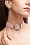Featuring a gold finish choker necklace studded with kundan polki and pink beads, set in brass. It is paired with a matching pair of earrings. Perfect for grand occasions like weddings and traditional festivities.